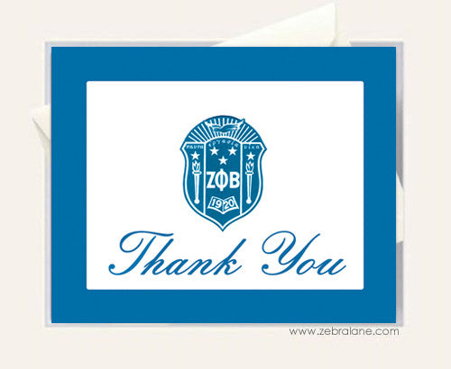 Zeta Phi Beta Shield Thank You Cards. Box of 10 cards and envelopes. Blank inside. Card size 5.5 x 4.25 inches. Glossy finish.